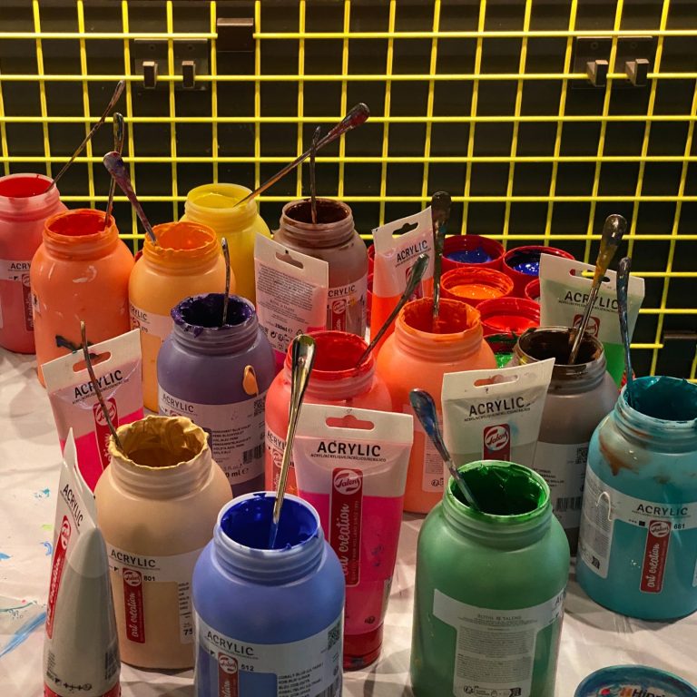 Wir stellen Euch die Farben, Leinwände und sonstige benötigten Materialien zur Verfügung. Einige der Metallic-Farben und besondere Farbtöne stellen wir selbst her, weil die Qualität noch besser ist, und man diese auch gar nicht kaufen kann.